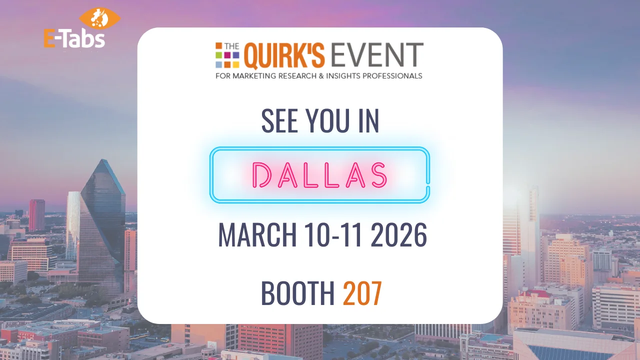 Join E-Tabs at The Quirk’s Event in Dallas this March, where we will be showcasing how automation is reshaping the way insight teams deliver reporting. Taking place on March 10 to 11, 2026 at Booth 207, the event is a great opportunity to see how we transform hours of manual slide building into a seamless, repeatable process that saves time while maintaining accuracy and consistency at scale. We are looking forward to reconnecting with familiar faces, meeting new teams and demonstrating our tools in action. If manual reporting is slowing you down, come and see how we turn complex workflows into the push of a button.